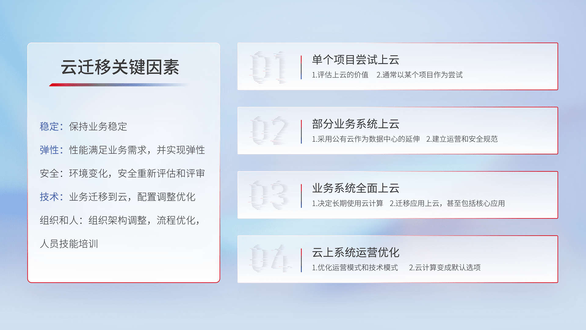 结合实际业务,,从规划设计、、、、云平台选型、、、云原生改造、、、、数据迁移、、、集成交付,,,,迁移全过程为客户识别最佳上云路径,,,,做好风险识别管理,,设计网络架构、、、身份权限、、、安全审计合规、、、操作审计、、、、日志审计、、监控告警策略、、、多站点容灾设计等,,,对云上基础设施进行整体规划,,,提升IT治理水平,,,,以满足弹性、、、高可用、、高性能的需求。。。